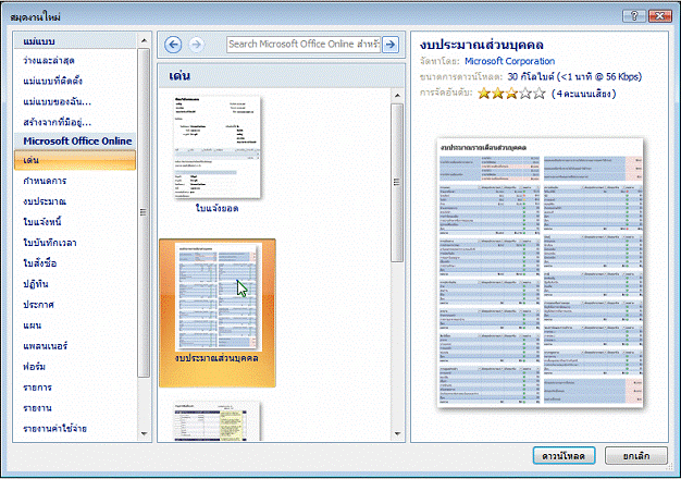 รูป แสดงการดาวน์โหลดแม่แบบ Excel 2007 จากเว็บไซต์ของ Microsoft Office