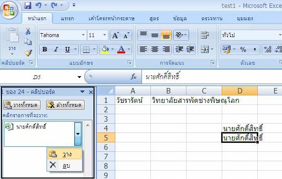 รูป แสดงการใช้คำสั่งวางข้อความใน Excel 2007 และจัดความกว้างคอลัมน์แล้ว