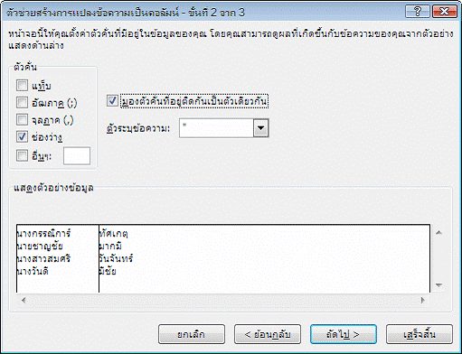 รูป แสดงตัวช่วยสร้างการแปลงข้อความเป็นคอลัมน์ขั้นที่ 2 เลือกชนิดตัวคั่นเป็นช่องว่าง