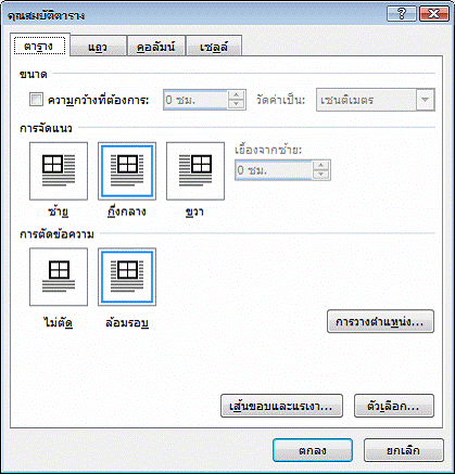 เราสามารถใช้คุณสมบัติตารางในการจัดการกับตารางได้ จากแท็บบริบทเค้าโครงของ แถบเครื่องมือตาราง จะเปิดกล่องโต้ตอบคุณสมบัติตารางขึ้นมา แล้วจึงเลือกแท็บงานที่ต้องการ ดังต่อไปนี้